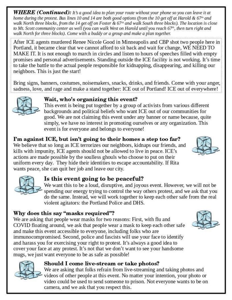 After ICE agents murdered Renee Nicole Good in Minneapolis and CBP shot two people here in Portland, it became clear that we cannot afford to sit back and wait for change, WE NEED TO MAKE IT. It is not enough to march in circles and listen to hours of speeches filled with empty promises and personal advertisements. Standing outside the ICE facility is not working. It’s time to take the battle to the actual people responsible for kidnapping, disappearing, and killing our neighbors. This is just the start!